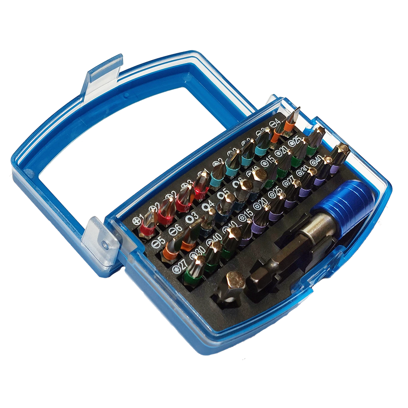 Díky barevnému kódování je výběr bitů snadný a rychlý. Sada zahrnuje bity o délce 25 mm, magnetický držák, adaptér pro nástrčkové klíče a praktický robustní box s klipsnou na opasek.